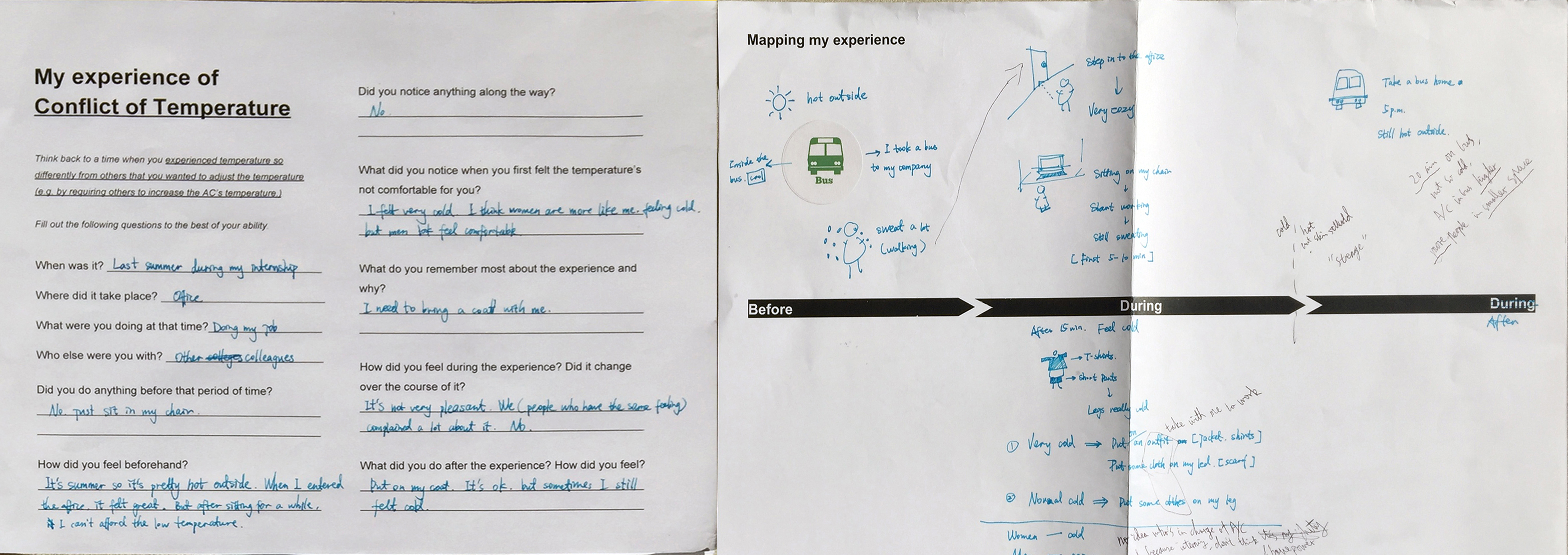 To engage the interviewers more, thus gather deeper insights and build better empathy, we followed the methodology of participatory design, which resulted in artifacts with insightful user journey as below: