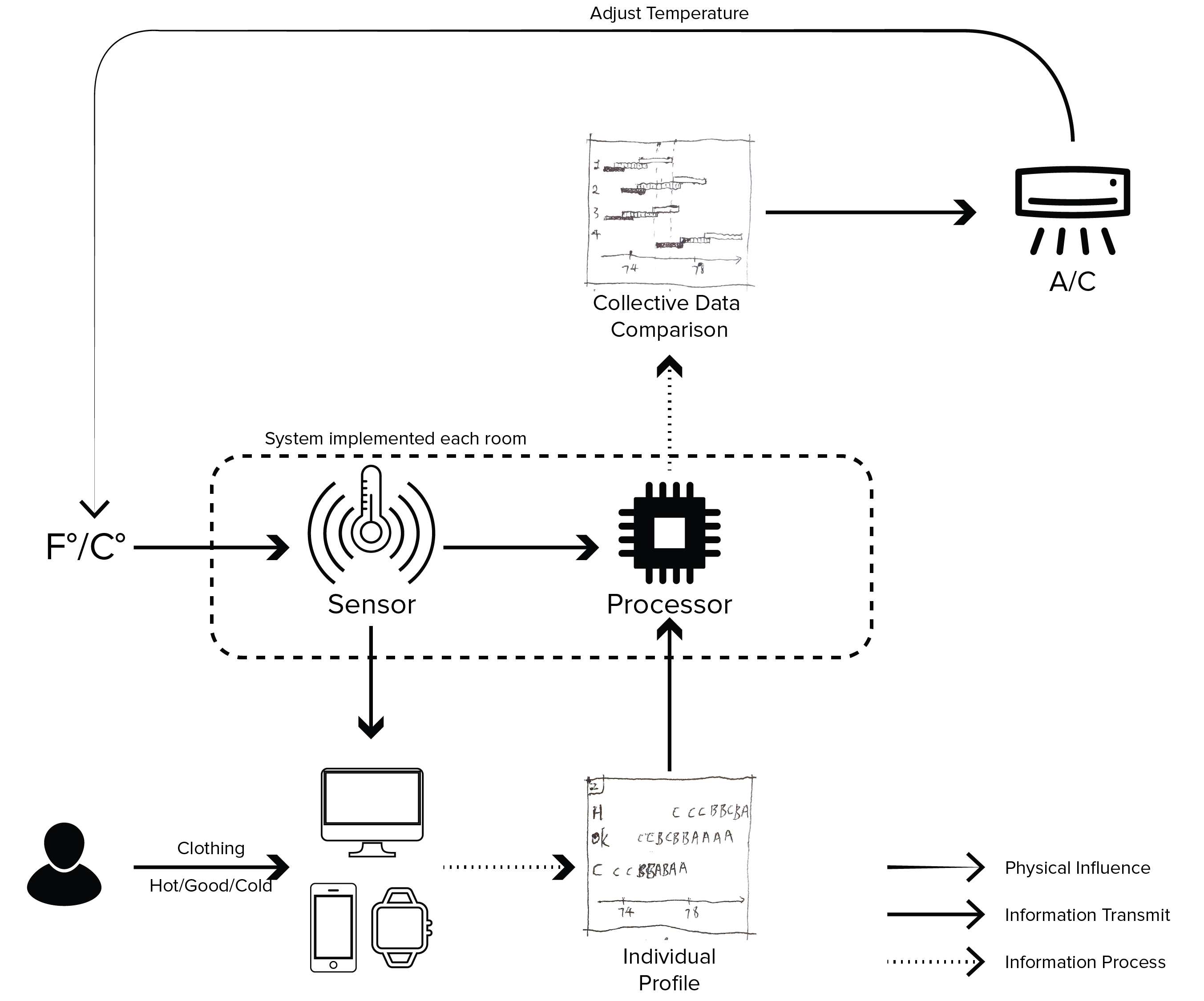 In order to assist users and make users trust the system, adaptability, accuracy and eco-friendliness (save energy) would be the keys. To ensure they are addressed, the diagram was produced to answer questions: